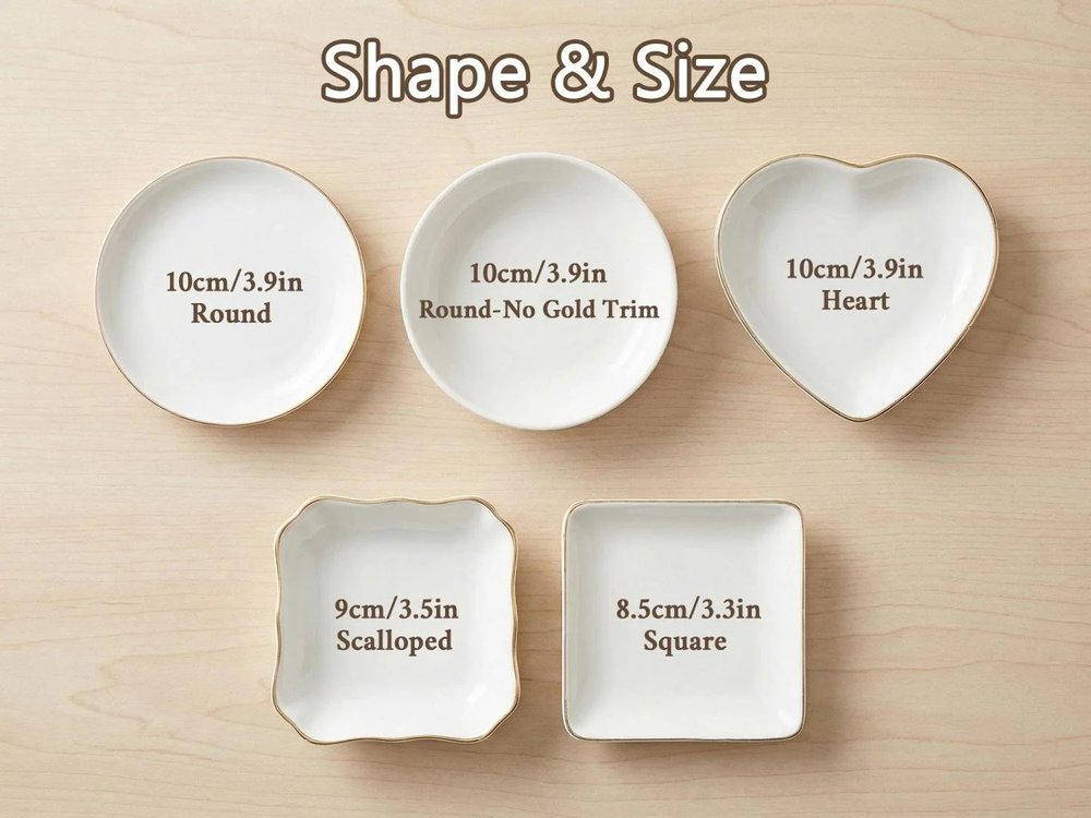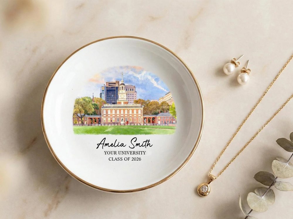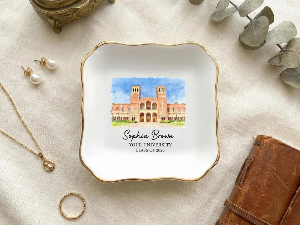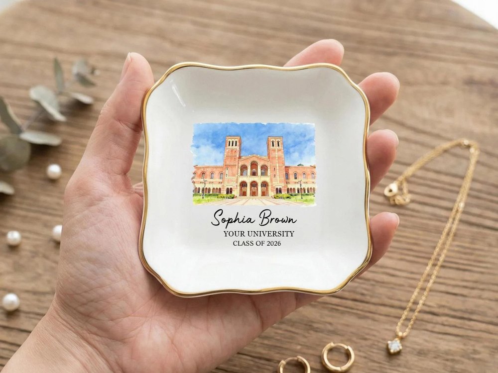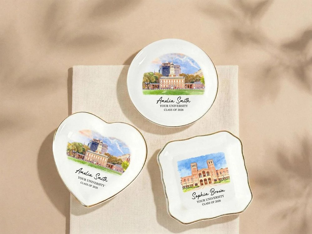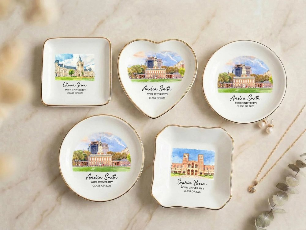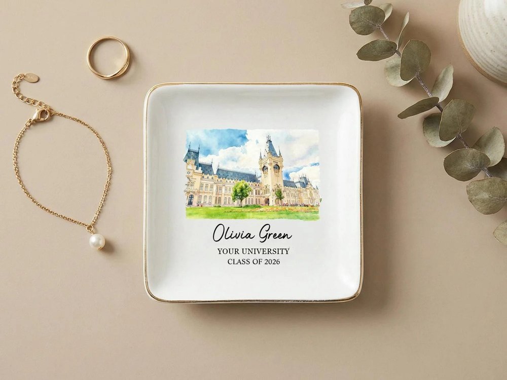 Fabriqué de manière experte en céramique blanche de haute qualité et durable, avec une finition lisse et brillante et une luxueuse bordure dorée sur les bords, ce porte-bijoux est conçu pour durer au fil des utilisations quotidiennes. L'impression vibrante et résistante à la décoloration de l'illustration du campus, du nom personnalisé, de l'université et de l'année d'obtention du diplôme reste vive et nette pendant des années, tandis que la construction robuste en céramique garantit qu'elle reste un bel objet de décoration fonctionnel pour tout meuble, bureau ou table de chevet. - Taille : Rond - 10 × 10 cm (3.9") Rond (sans bordure dorée) - 10 × 10 cm (3.9") Coeur - 10 × 10 cm (3.9") Carré - 8,5 × 8,5 cm (3,3") Festonné - 9 × 9 cm (3,5")